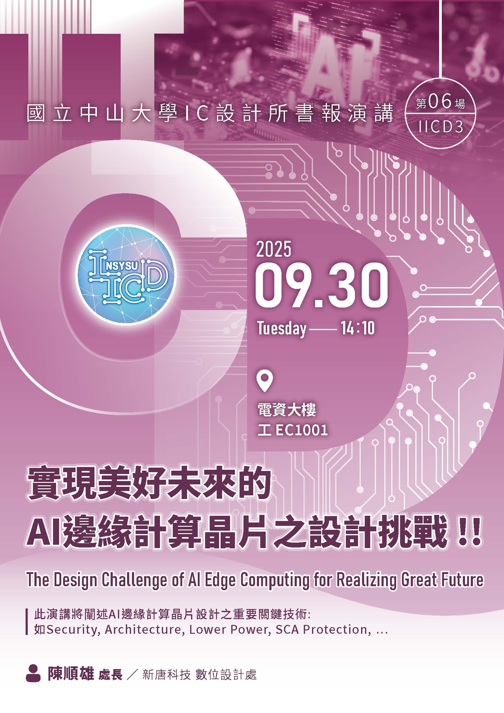 講題:實現美好未來的AI邊緣計算晶片之設計挑戰 !! (The Design Challenge of AI Edge Computing for Realizing Great Future)